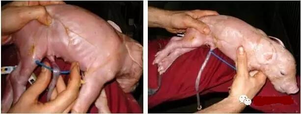 猪仔的脐带长,常常在脐带里滞留有大约2~3毫升血液(即脐血,内含多量的造血干细胞)。接产员应将仔猪放在地板下,半仰卧,右手轻握脐带远端。左手从远端向脐眼勒脐带,让脐血经脐肝管注入仔猪体内。